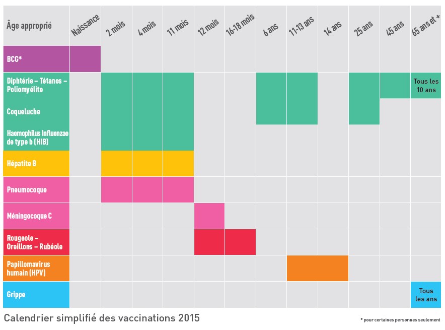 Ce calendrier des vaccinations 2015 est accompagné de neuf tableaux synoptiques disponibles sur le site du ministère chargé de la santé