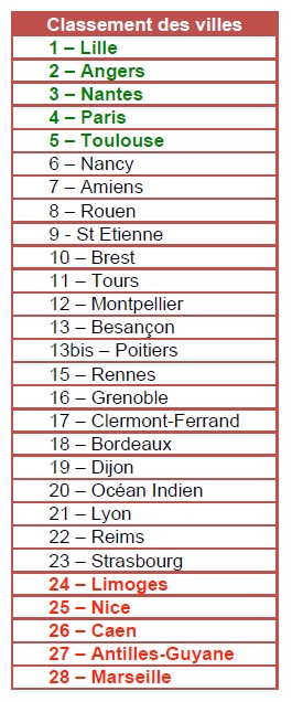 Résultats : Lille monte sur la 1ère marche du podium devant Angers, Nantes, Paris (toutes facultés confondues) et Toulouse. La fin du classement est occupée par Limoges, Nice, Caen et les Antilles-Guyane et Marseille qui recueille le plus fort taux d’étudiants insatisfaits de leur formation (83,4 %).