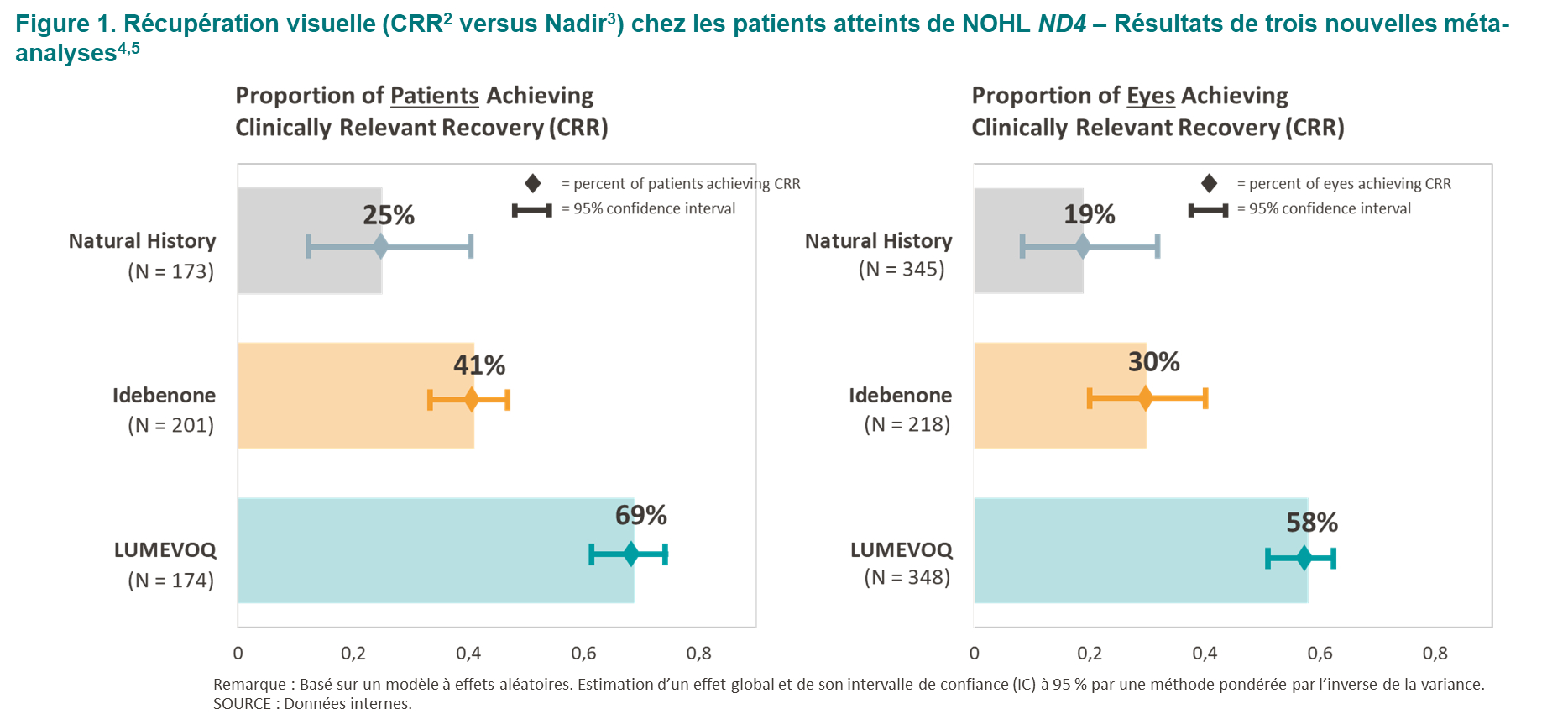 Les méta-analyses mettent en évidence un gradient d’efficacité de la thérapie génique intravitréenne LUMEVOQ® permettant d’obtenir une récupération visuelle plus élevée que celle du traitement par idébénone et plus élevée que celle de l’évolution naturelle de la maladie. Ce gradient de récupération, basé sur la mesure du CRR en termes d’amélioration d’acuité visuelle, est observé tant au niveau des yeux qu’au niveau du patient (réponse d’un œil ou des deux yeux). L’absence de chevauchement des intervalles de confiance lorsque LUMEVOQ® est comparé à l’idébénone et à l’évolution naturelle indique une différence positive entre les résultats visuels.