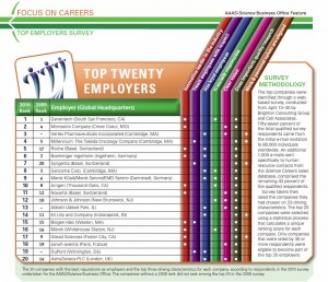 Le magazine Science a publié le 8 octobre dernier son palmarès annuel des vingt meilleurs employeurs de l’industrie biopharmaceutique. Cette année encore, Genentech prend la tête du classement. Une première marche que la société californienne occupe pour la huitième fois en neuf ans de classement. Monsanto, basé à Saint-Louis dans le Missouri arrive en deuxième position, suivi de Vertex Pharmaceuticals à Cambridge dans le Massachusetts qui complète le trio de tête.
