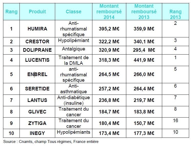 C’est l’Humira®, un anti-rhumatismal, qui est désormais le 1er médicament de ville remboursé avec 395 M€ de dépenses (2ème rang l’année précédente).
