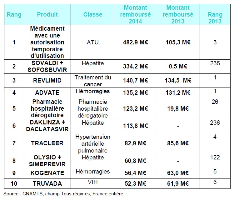 Par conséquent, les premiers produits en termes de hausse des dépenses rétrocédées (hors ATU et prise en charge dérogatoire de la pharmacie hospitalière) sont Sovaldi® (Sofosbuvir, +334 M€ en 2014), Daklinza® (Daclatasvir, +114 M€) et Olysio® (Siméprévir, +61M€).