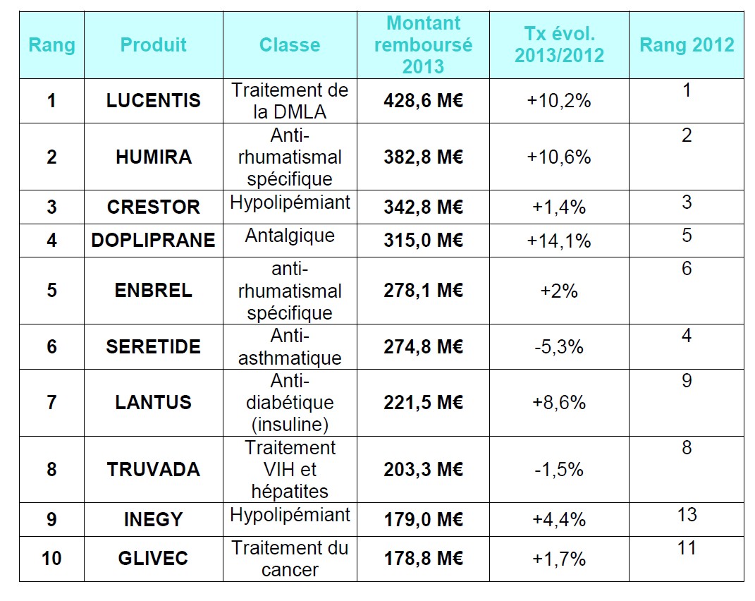 – Comme en 2012, le 1er médicament de ville remboursé est le Lucentis®, médicament indiqué dans la dégénérescence maculaire liée à l’âge (DMLA), avec 428 M€ remboursés. Malgré une baisse de prix en deux étapes (juillet 2012 et février 2013), la progression est toujours marquée (+10% soit 40 M€). Il faut également souligner l’arrivée sur le marché en novembre 2013 d’Eylea®, dont les remboursements ont atteint 12 M€ en seulement 2 mois.