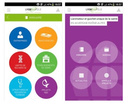 Développée en partie grâce au soutien de la Région Auvergne-Rhône-Alpes, cette application est disponible sous environnement Iphone et Androïd, à la fois pour les adhérents de Lyonbiopôle et pour l’ensemble des acteurs de la santé. L’interface d’accueil de l’application propose à tous les utilisateurs quatre fonctionnalités principales :