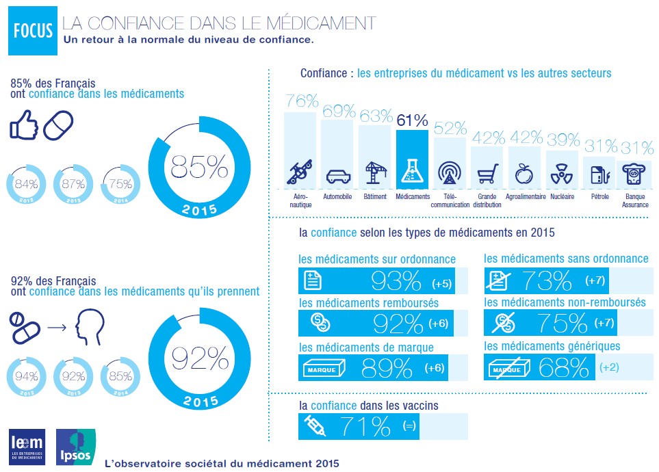 Les entreprises du médicament sont perçues comme « utiles » (87 %, + 2 points), « à la pointe du progrès » (81 %, + 2 points) et « efficaces » (78 %). En revanche, « dans un contexte d’accumulation de controverses sur le médicament en France depuis 2011 », seuls 37% des Français estiment que les entreprises du médicament sont éthiques et 18 % transparentes (18 %).