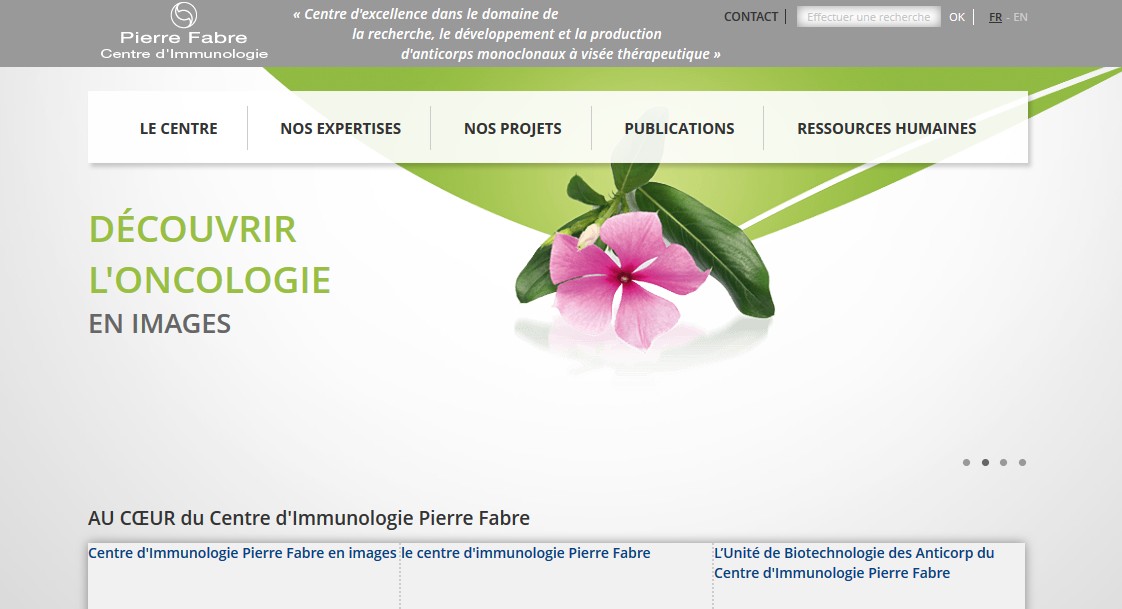 Ce site qui s’adresse principalement à la communauté scientifique et à des partenaires éventuels met en avant l’expertise du Centre dans le domaine des biotechnologies, notamment en production de lots cliniques d’anticorps réalisés au CIPF.