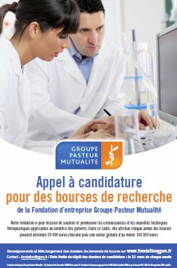 Forte de son succès depuis 3 ans, la Fondation d’Entreprise Groupe Pasteur Mutualité lance à nouveau en 2012 un appel à candidature pour ses bourses d’aide à la recherche médicale. Plusieurs prix d’une valeur totale d’au moins 100 000 € seront attribués à des chercheurs en santé de moins de 40 ans, qu’ils soient en formation (internes) ou praticiens.