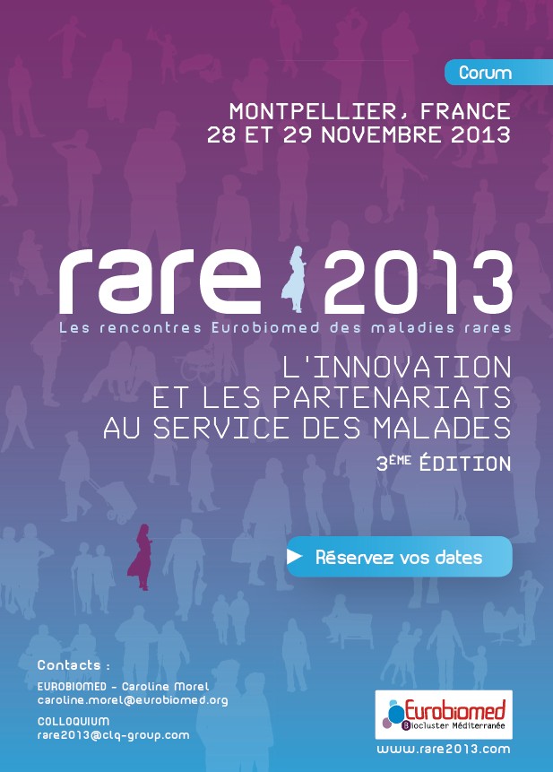 Les rencontres RARE 2013, organisées par le pôle de compétitivité Eurobiomed, se déroulent les 28 et 29 novembre au Corum de Montpellier. L’objectif de l’évènement est de réunir et faire travailler ensemble tous les acteurs des maladies rares : scientifiques, chercheurs et cliniciens, acteurs industriels, associations de patients mais aussi représentants des autorités réglementaires.
