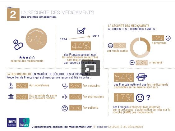 Le Leem propose une infographie qui illustre la perception qu’ont les Français sur la sécurité sur la sécurité des médicaments. Ainsi, 54% des Français estiment que les médicaments disponibles sur le marché sont sûrs.