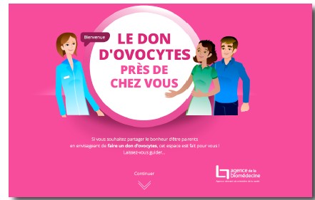 Concrètement, en consultant le site www.dondovocytes.fr, la future donneuse est orientée vers l’espace « Le don d’ovocytes près de chez vous ». Accueillie par « Julie », une conseillère virtuelle, elle peut, après avoir indiqué son code postal, découvrir toutes les informations utiles sur le don d’ovocytes près de chez elle. Il répond également à toutes les questions que se pose une femme avant d’initier sa démarche de don : « Où s’adresser ? », « Qui va s’occuper de moi au centre d’AMP ? », « Comment se passera le don ? », « Comment devenir donneuse ? », …